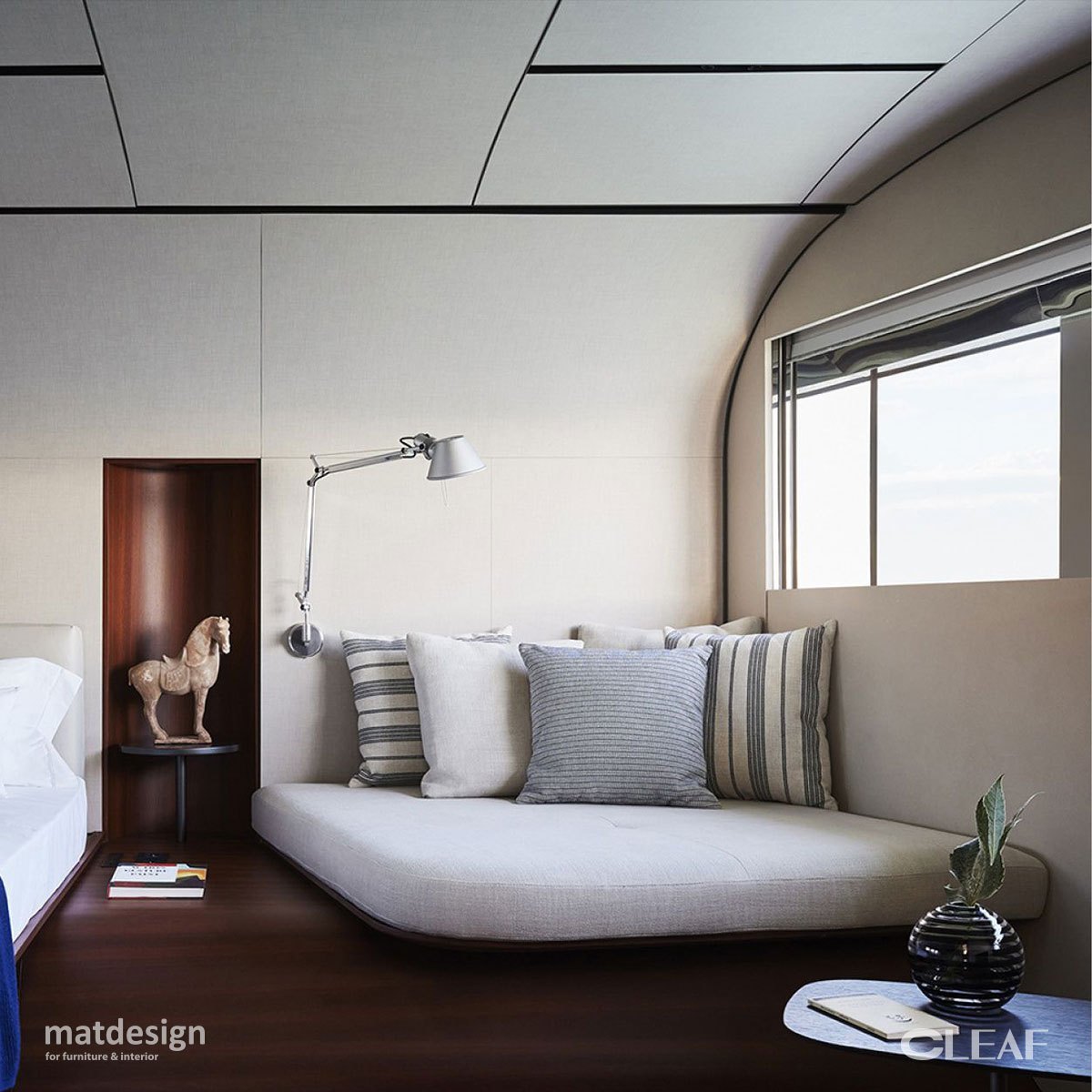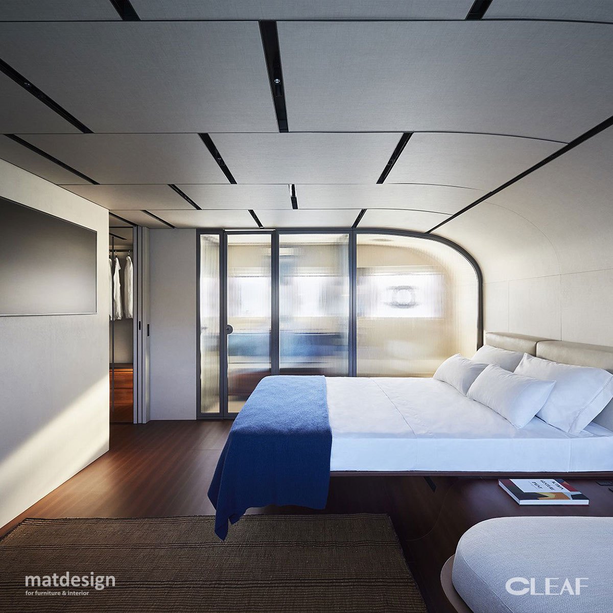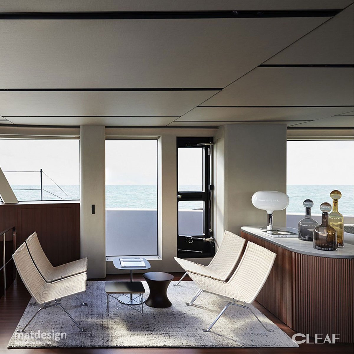 Na sufitach i ścianach na górnym, głównym i dolnym pokładzie zastosowano powierzchnię Alpaca FA44 od Cleaf – inspirowaną delikatnością i blaskiem jedwabistego włókna, które niegdyś zdobiło stroje inkaskich cesarzy.
